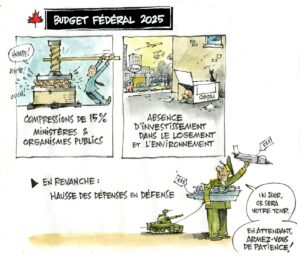 Il nous faut pour réagir au budget militairo-nucléaire de Carney, critiqué avec raison par l’universitaire Tamara Lorincz « It’s also a budget for a class war against women, youth, the poor and immigrants », mais à peine écorché par le Parti Vert et le NPD. Radio-Canada s’enferre dans ses analyses en conflit d’intérêt, puisque Poilievre promettait de supprimer la CBC. Pourquoi démoniser Poilievre qui s’en est chargé lui -même avec son extrémisme pro-camionneurs rebelles de 2022? Les analystes répètent la difficulté de son parti à rester uni, sans écrire ou dire la SIMPLE vérité que le budget « libéral » est de telle droite, qu’il ne laisse aucune place à aucune droite! On voudrait voir le Bloc Québécois critiquer la faiblesse majeure du budget, si bien dénoncée par Yves Engler iii et par le dessin de presse (CSN) de notre cher AplP2023 Jacques Goldstyn, APLP 2023: